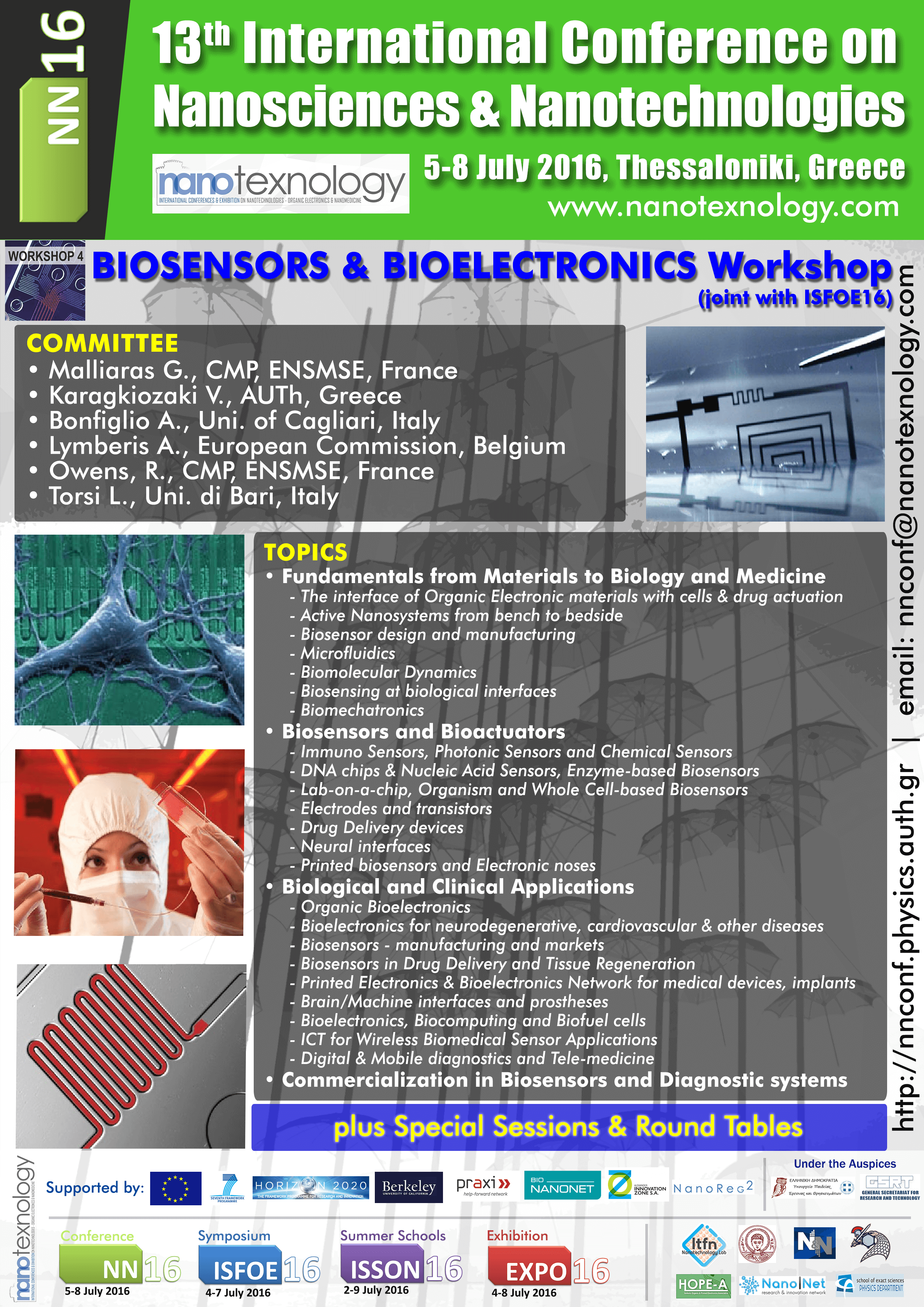 Do Not Miss the Special Workshops, Events and Round Tables, covering the latest developments in the fields of Photovoltaics, Biosensors and Bioelectronics, Graphene and related materials, NanoMedicine related Issues, NanoConstruction, Computational Modeling, NANO-GR Special Workshop, Nanomaterials & Bionanoscience in Japan-Europe Cooperation Special Workshop, Special Workshop on Agrofood, Commercialization and EU funded Projects on Nanosciences and Nanotechnologies!